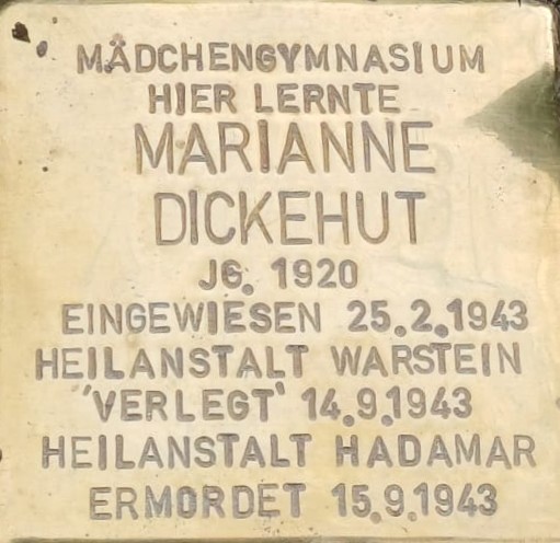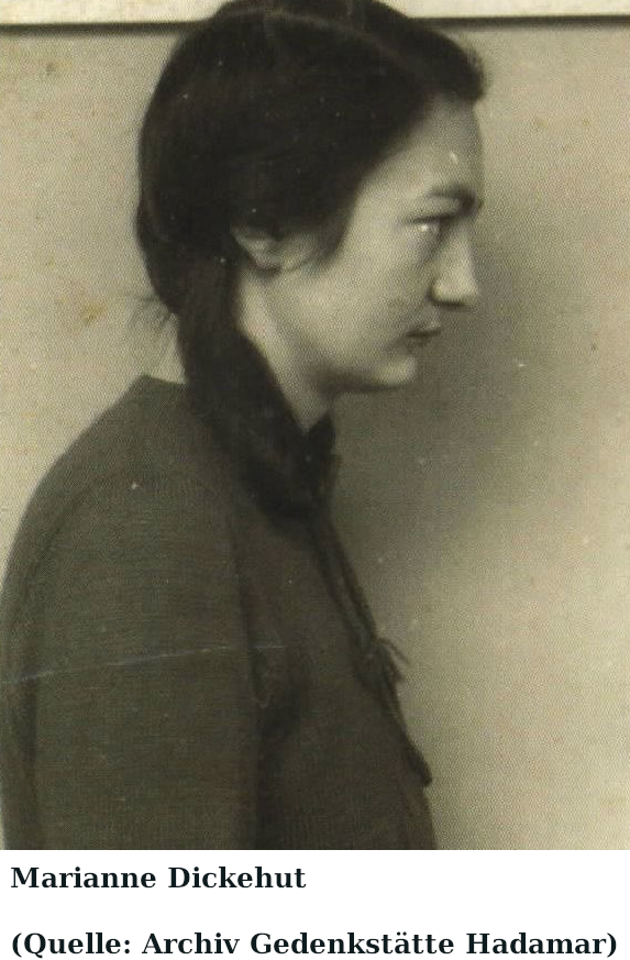 "Die Bürogehilfin Marianne D. aus Lüdenscheid, zur Zeit in der Provinzialheilanstalt in Warstein ... leidet an Schizophrenie; sie ist somit erbkrank und gemäß §1 des Gesetzes zur Verhütung erbkranken Nachwuchses vom 14. Juli 1933 unfruchtbar zu machen. ...Zwischen den beiden Einweisungen nach Warstein schrieb Marianne eine Reihe von Briefen an verschiedene Behörden, immer mit der Bitte verbunden, man solle sich mit ihrer Situation befassen.