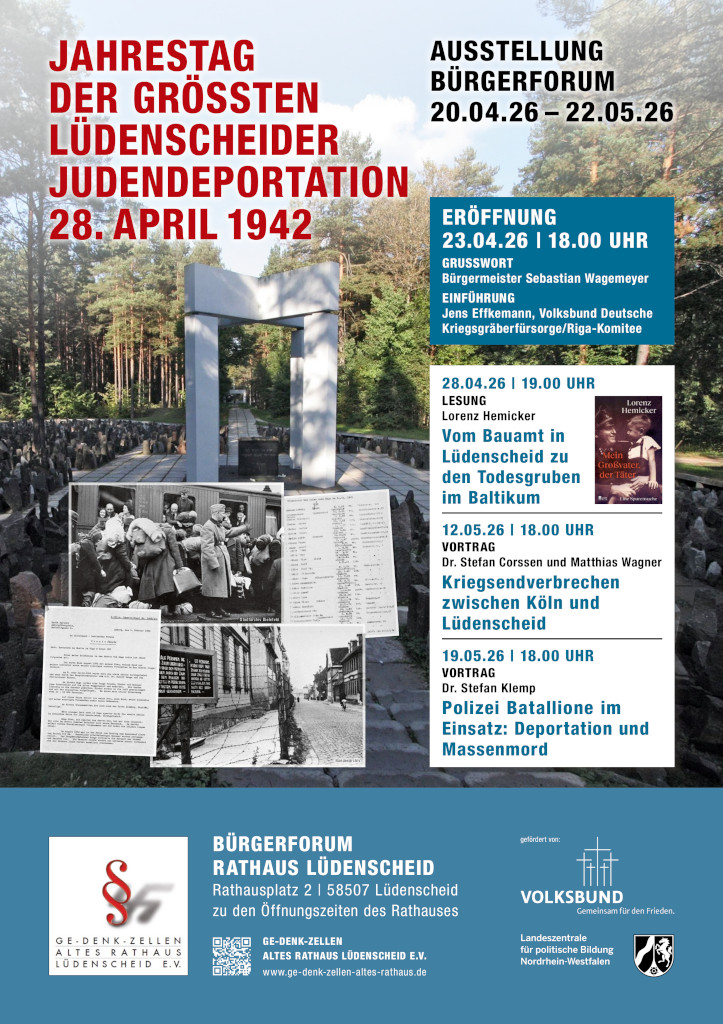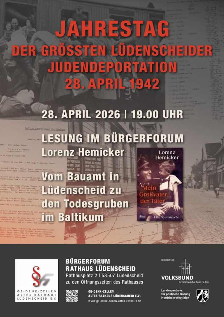 Am 28.April 1942 deportierten die nationalsozialistischen Machthaber die größte Gruppe jüdischer Bürger aus Lüdenscheid und dem Regierungsbezirk Arnsberg "in den Osten". An dieses Ereignis erinnern der Ge-Denk-Zellen-Altes-Rathaus e.V. in Kooperation mit dem Volksbund Deutscher Kriegsgräberfürsorge mit einer Ausstellung des Riga-Komitees. Dies ist ein Zusammenschluss von über 50 Kommunen aus NRW und weiteren Städten, die an die Deportationen und Ermordung von jüdischen Bürgern ins Baltikum erinnert. Ein Gedenkort nahe Riga wird von diesem Komitee unterstützt und gepflegt.