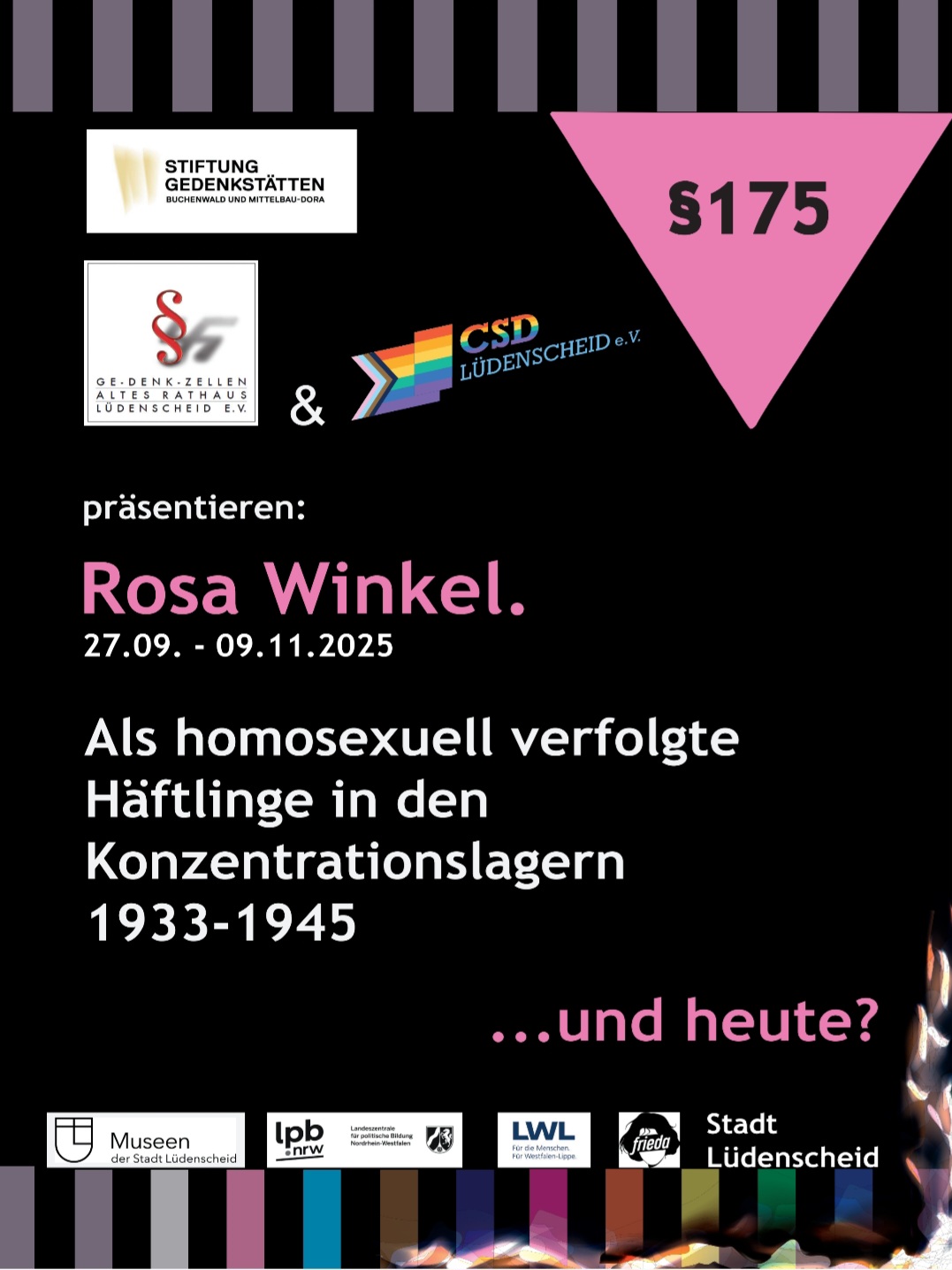 Wir zeigen dort vom 27. September bis zum 09. November 2025 die umfangreiche Ausstellung "Rosa Winkel - als homosexuell verfolgte Häftlinge in den Konzentrationslagern Buchenwald und Mittelbau-Dora", die wir um drei Lüdenscheider Biographien ergänzt haben.